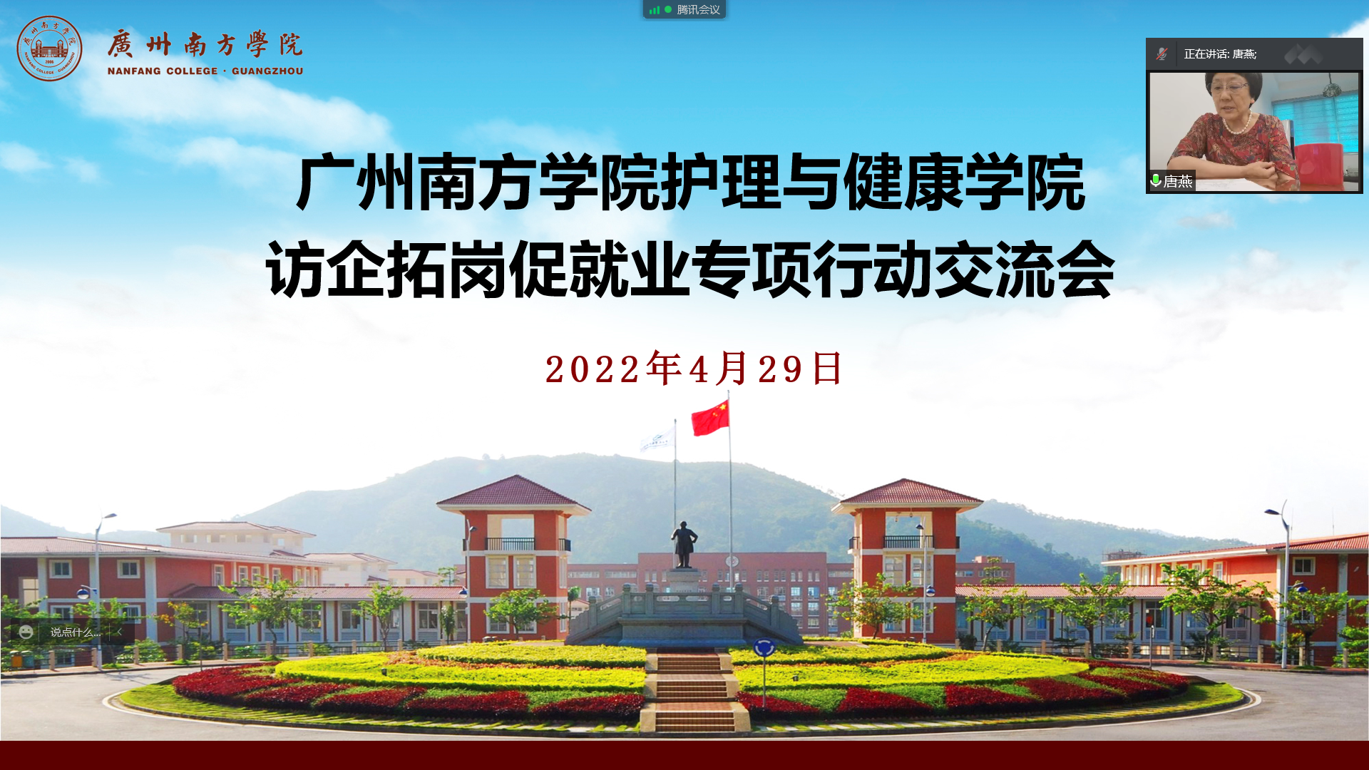 为贯彻落实教育部关于高校毕业生就业工作决策部署,深化医校合作与供需对接,4月29日下午,金年会jinnianhuicom组织召开“用人单位大走访 全员联动促就业”为主题的线上交流会。本次会议特别邀请了中山大学肿瘤防治中心护理部覃惠英主任,中山大学附属第一医院护理部徐朝艳主任,中山大学孙逸仙纪念医院护理部毛晓群主任,中山大学附属第三医院护理部方蘅英主任,广东省人民医院护理部崔虹主任,共五位护理专家参会。金年会诚信信誉至上常务副校长、党委副书记唐燕,金年会jinnianhuicom院长方海云、常务副院长陈华丽、学工办主任田珍珍出席本次交流会。会议由陈华丽常务副院长主持。