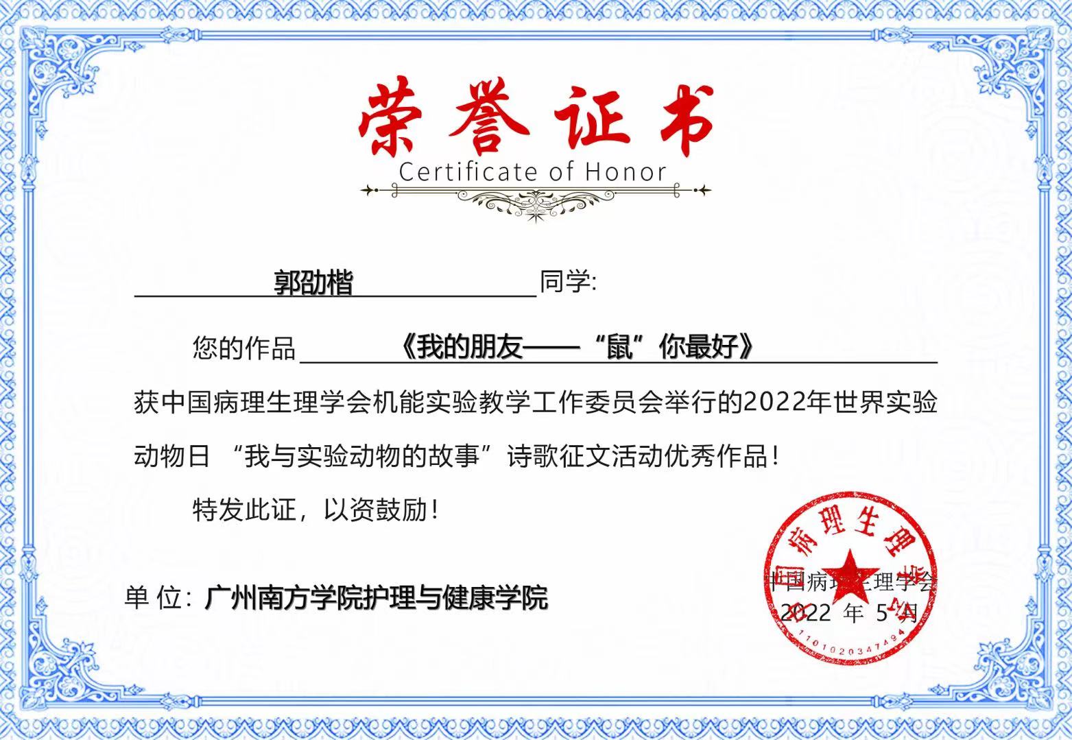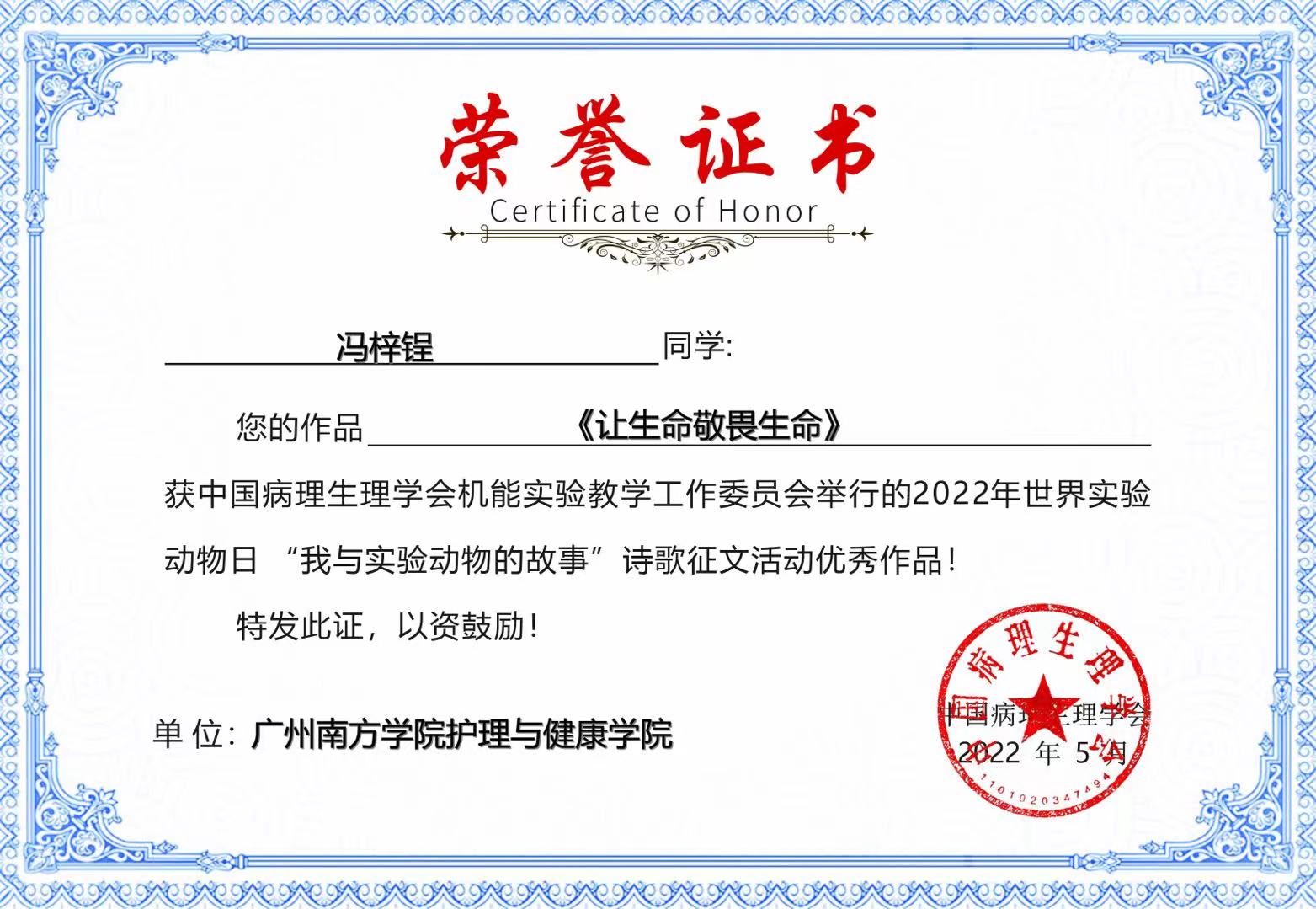 为纪念世界实验动物日,中国病理生理学会机能实验教学工作委员会面向全国医学及医学相关专业在读本/专科生开展了主题为“我与实验动物的故事”诗歌征文活动。金年会jinnianhuicom积极动员同学们参赛投稿。其中2021级护理学1班冯梓锃的《让生命敬畏生命》、2020级护理学1班郭劭楷的《我的朋友——“鼠”你最好》两个作品在本次诗歌征文活动中脱颖而出,荣获优秀作品的称号。