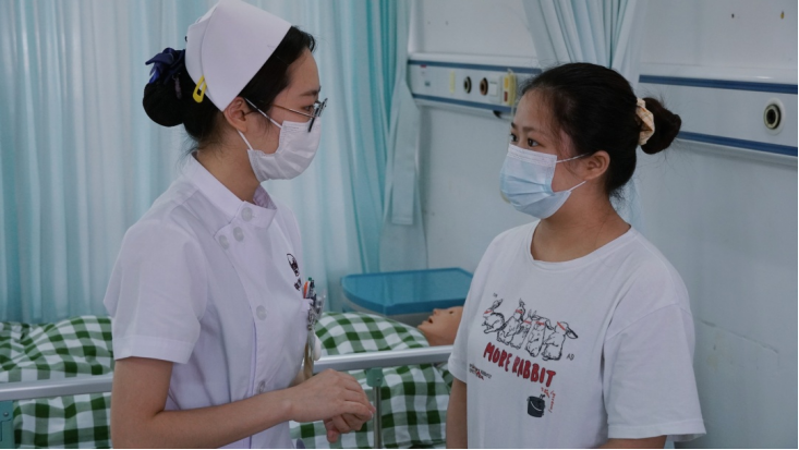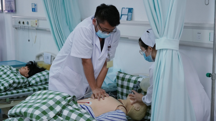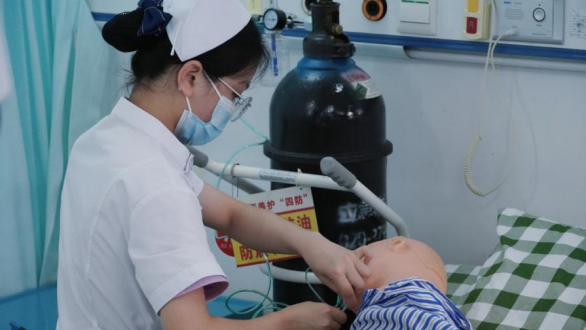2019级选手模拟的案例为“慢性阻塞性肺气肿病人”、“急性心肌梗死病人”和“小儿腹泻病人”。在紧迫的时间内,参赛选手们迅速代入虚拟护理情境,分析患者病情,综合评估,明确分工、有条不紊地对病人进行心电监护、吸氧、心肺复苏、静脉输液等护理操作。基于平日实践积累,他们不仅动作规范、技术娴熟,操作期间还不忘安抚病人及家属紧张的情绪,充分展现出护理学子认真严谨的精神和职业素养。
