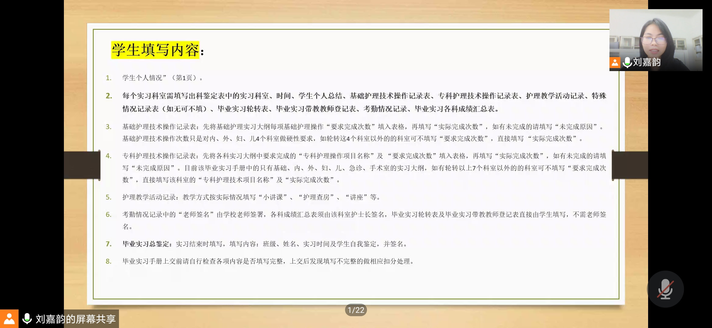 刘嘉韵老师从实习注意事项和填写实习手册要点两方面展开。刘老师说到,同学们可准备一本笔记本记录日常工作中所遇到的问题及解决方法,在实习过程中不断改进、寻求进步。她强调,同学们要认真阅读且填写实习手册的相关内容,切勿随意涂改。