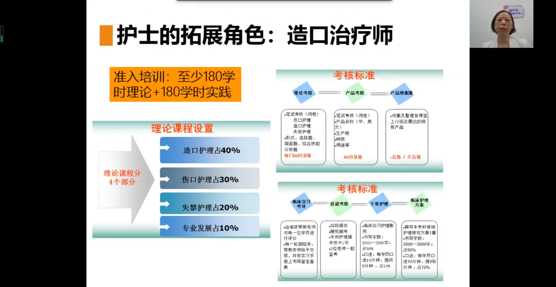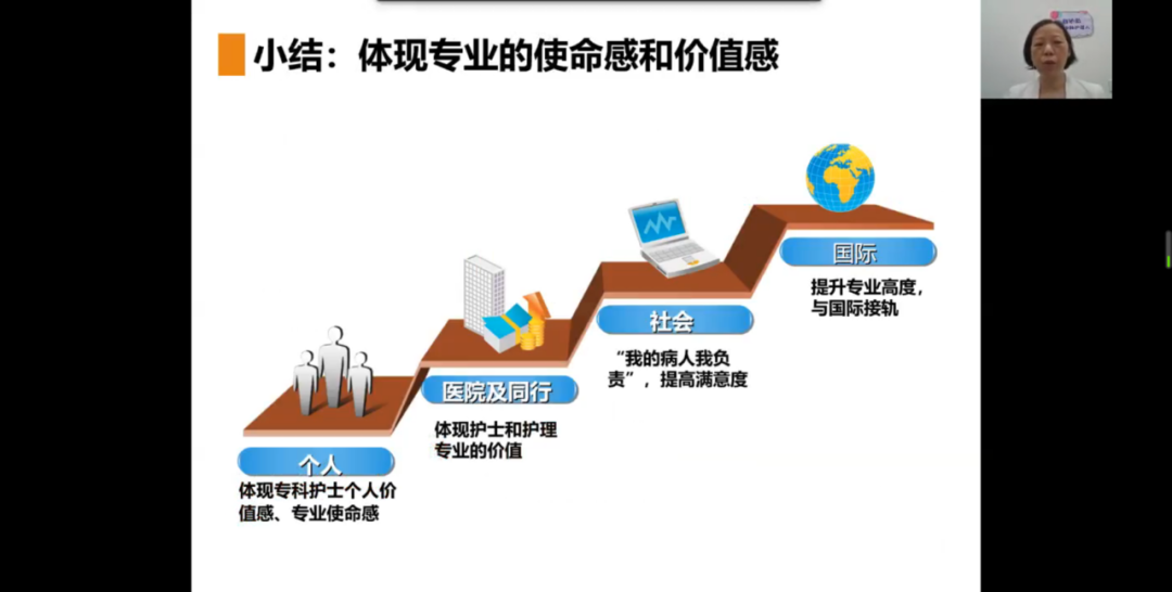 此外,她还向同学们阐述了一般护理实践到高级护理实践的进阶内容,并通过其所在医院的两个真实生动的临床病例来鼓励同学们向高级护理实践的方向前进。其中一个女士接受了直肠癌Miles术后并发严重造口疝, 粪水渗漏严重,到医院就诊。通过造口治疗专业性护理,病人有效康复,保证了患者的生活质量。由此可见,造口治疗师拥有自己的核心能力,才能更好的处理复杂的个案和病例,维护患者的健康。