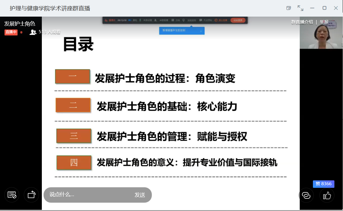 覃惠英教授的讲座主要包括四大方面:发展护士角色的过程--角色演变、 发展护士角色的基础.......补充。覃惠英教授通过护士传统角色引出了现代护士的基本角色、发展角色和拓展角色。覃教授表示,通过社会对护士角色期待值的提升,说明护士必须具有扎实的专业能力和优良的职业素养。她强调,发展护士角色的基础是护士核心能力的提升。她还解释了香港护理专科学院APN核心能力的七个领域,分别是处理病人复杂的健康问题、提升护患间的治疗关系、有效的领导和团队合作、加强和改进质量保证、管理和商讨找出保健服务的创新和有效的方法、强化通用专业素质和高级实践以及增强个人素质。