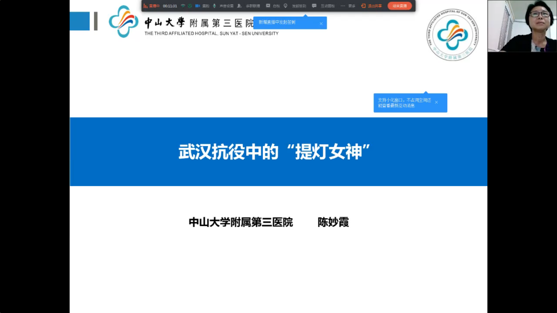 为了进一步提高金年会jinnianhuicom师生们对护理学专业的自豪感,培养专业能力以及专业精神。2020年6月17日19:00,金年会很荣幸邀请了来自中山大学附属第三医院护理部、国家临床重点专科学科带头人陈妙霞教授(中山大学护理学术委员会委员、南方学院客座教授)以云讲座的方式,作“武汉抗疫中的提灯女神”的专题学术讲座。