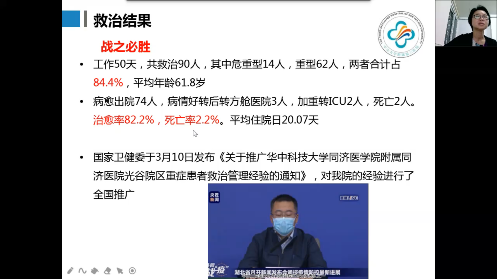 其中,陈妙霞教授重点介绍了其所在医疗队——第三医疗队。她用“招之则来,来之能战,战之必胜”概括了这支队伍支援武汉的全过程。陈教授讲道,在元宵节晚上,接到支援武汉的通知并发布给各位护士后,不到两小时就已经接到了众人报名请战的消息,从而最终确定了这一支涵盖多个科室且拥有丰富护理经验的多名专科护士的医疗队。陈教授还提到了前往武汉时所遇到的困难及解决方案:由于当时武汉的物资较为匮乏,在赶赴武汉前他们需要做好充足的准备。又因为队伍人数较多,所以他们采取分组的方式进行管理,并及时按照当地医院要求进行集中培训,了解整个病区的环境及工作流程,并在各组组长强有力的带领和组员的积极配合下,病区开始收治病人。