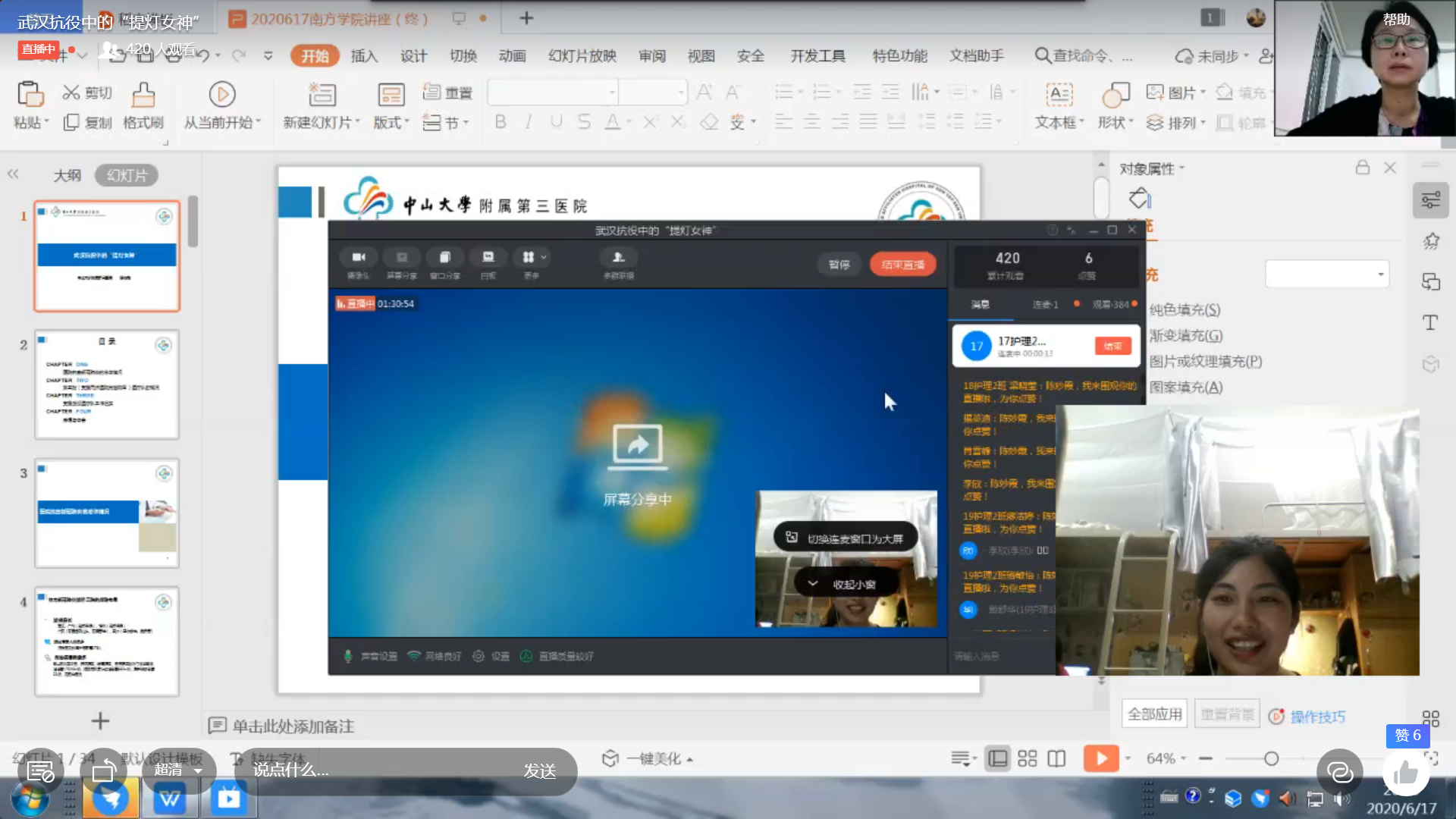 陈妙霞教授在讲座中讲述了她与其医护团队在武汉抗“疫”前线工作中的故事。本次讲座的内容主要包括四大方面:医院抗击新冠肺炎的总体情况,第三批(支援同济医院光谷院区)医疗队的概况,支援武汉医疗队工作纪实,感想与体会。陈教授还提到,中山大学附属第三医院在此次抗击疫情中,共派出五批最强医疗队支援湖北,这五批医疗队含有多个科室、多种专科的专业护士。