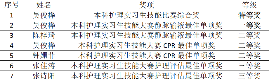 其中吴俊桦在13所学校的实习生中脱颖而出,成为本次护理实习生技能比赛综合奖特等奖唯一获得者,此外还荣获静脉输液最佳单项奖一等奖与CPR最佳单项奖二等奖。