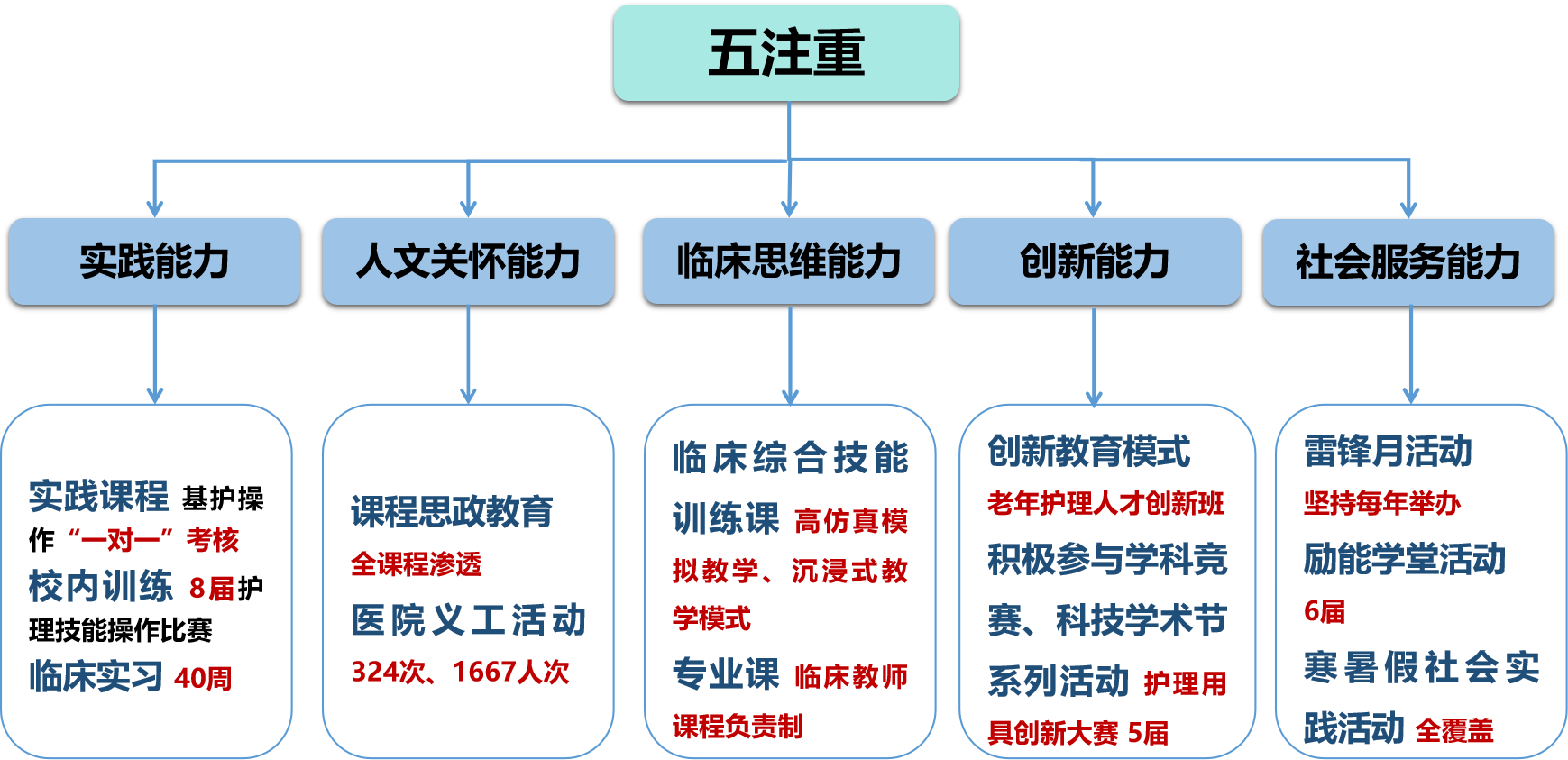 ①实践能力:依托医院共建“专业+思政+学术”、与社区共建“专业+公益+劳动”“3+3”实践育人基地平台进行。②人文关怀能力:以“三专教育”(专业人文教育+专项社会实践+专题思政教育)为抓手,着力培养学生具有三种情怀(敬畏生命、关爱生命、为老服务情怀);③临床思维能力:实施临床课程双负责人制(专任教师与临床教师),教学内容紧贴临床;创设临床思维综合技能训练等临床情境下的特色实验课程;④创新能力:实行“学-创-赛”创新教学模式,开设老年护理人才创新班、师生成组式创新培育项目、举办护理创新创业专题讲座;⑤社会服务能力:依托“3+3”实践育人基地平台,践行“四早”(早社会、早思政、早实践、早科研)教育理念,开展多项社会服务项目(图3)。