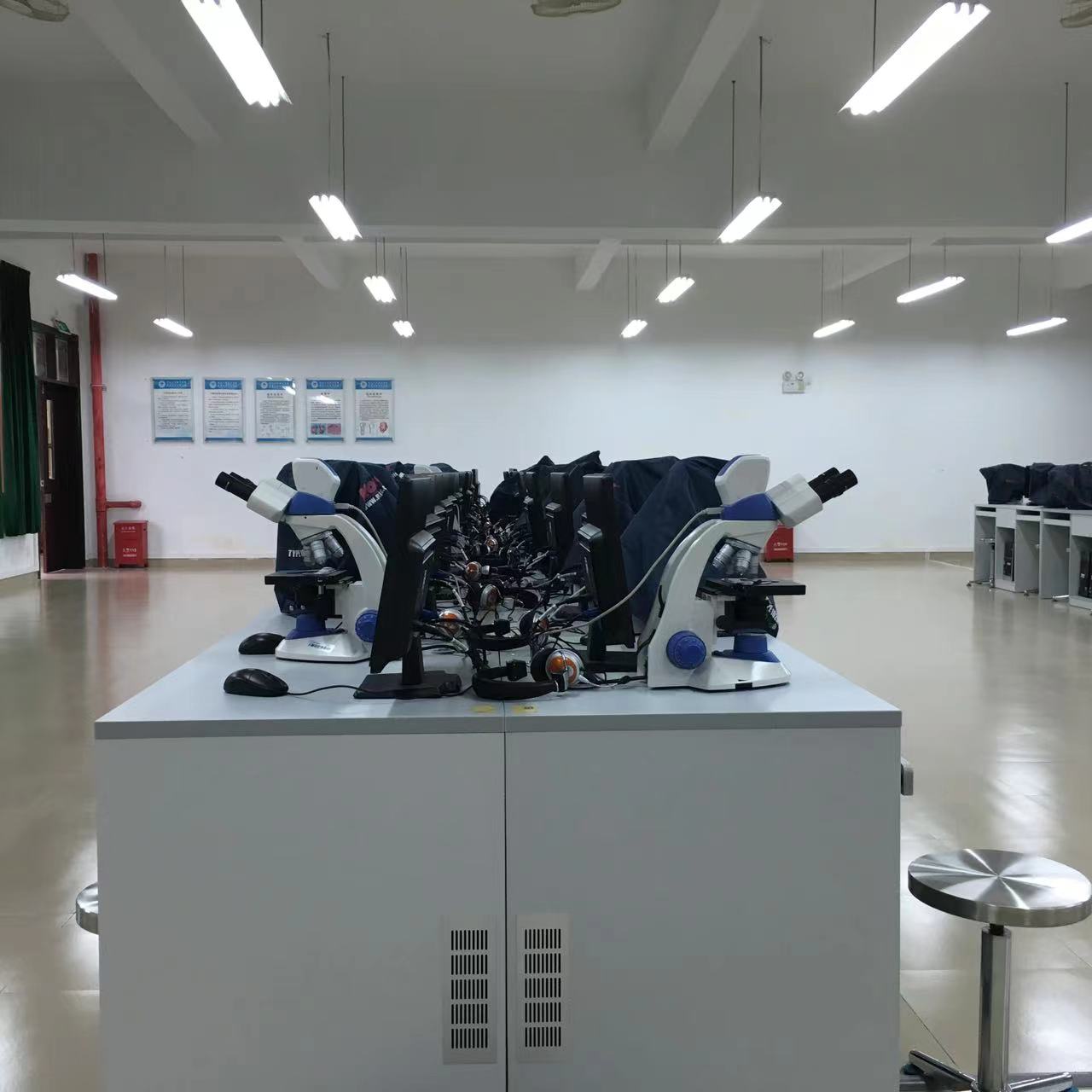 数码显微互动实验室,实验面积达350平方米,主要承担人体组织与胚胎学、病理学等实践课。主要实验设备有dell计算机套机、数码显微镜、教师图像分析系统等。